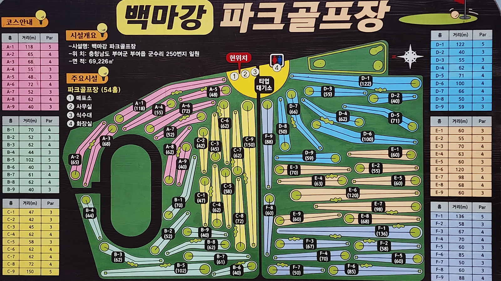 총 6개 구장(A~F)으로 구성된 백마강 파크골프장은 구장당 9홀씩 총 54홀 규모이며, 당일 선착순으로 자유롭게 이용 가능합니다.